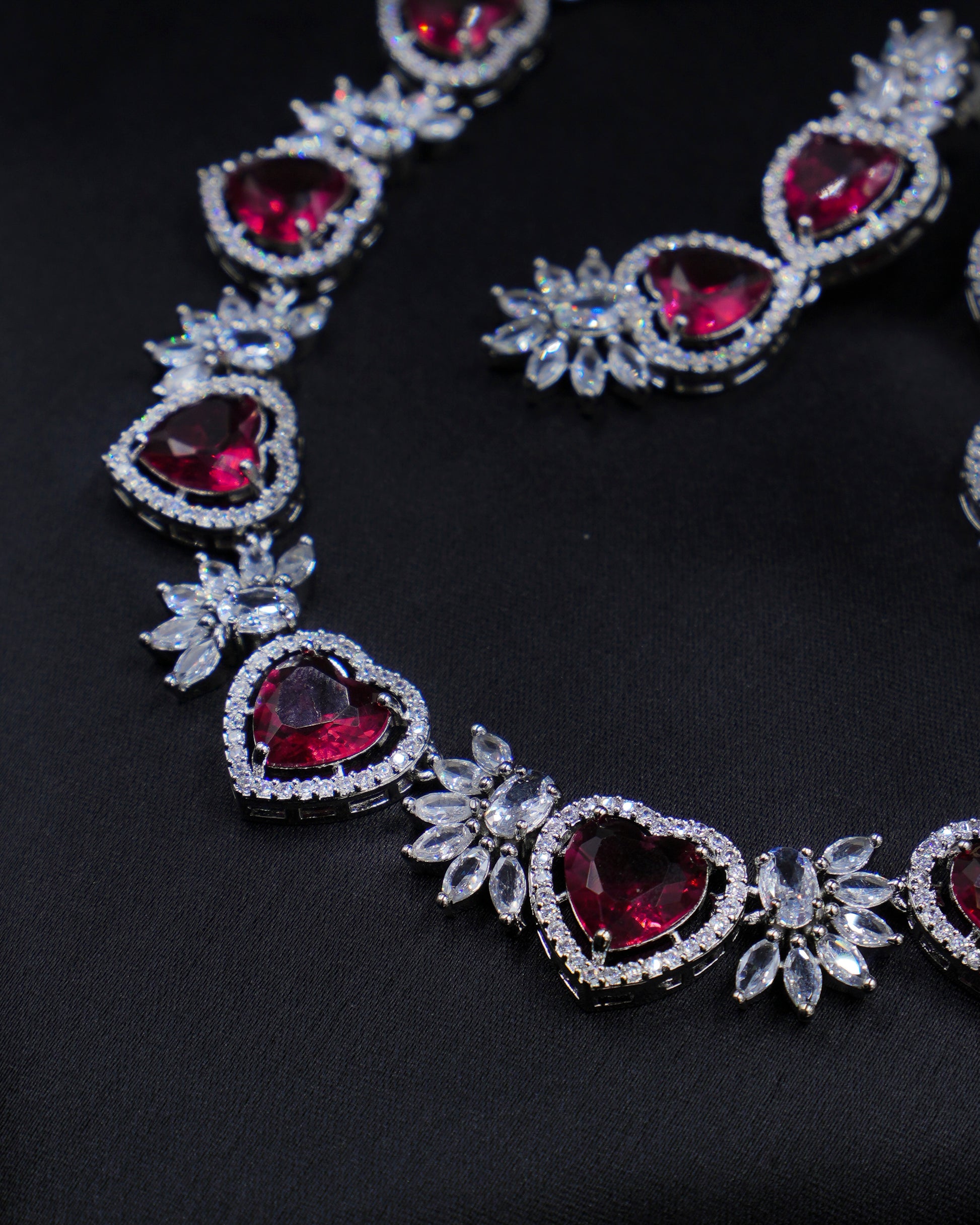 This mesmerizing Ad necklace radiates brilliance with its stunning red ruby heart stone at the center, symbolizing passion and elegance. Surrounded by shimmering American diamonds, the intricate design blends modern sophistication with timeless charm. Perfect for romantic evenings, weddings, and grand celebrations, this exquisite piece is a must-have in your jewelry collection.