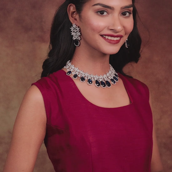 This stunning choker set features an intricate floral-inspired design, crafted with high-quality American diamonds set in a silver-tone base. The dazzling white stones create a radiant brilliance, while the deep blue teardrop-shaped gemstones add a striking contrast, enhancing its luxurious appeal.