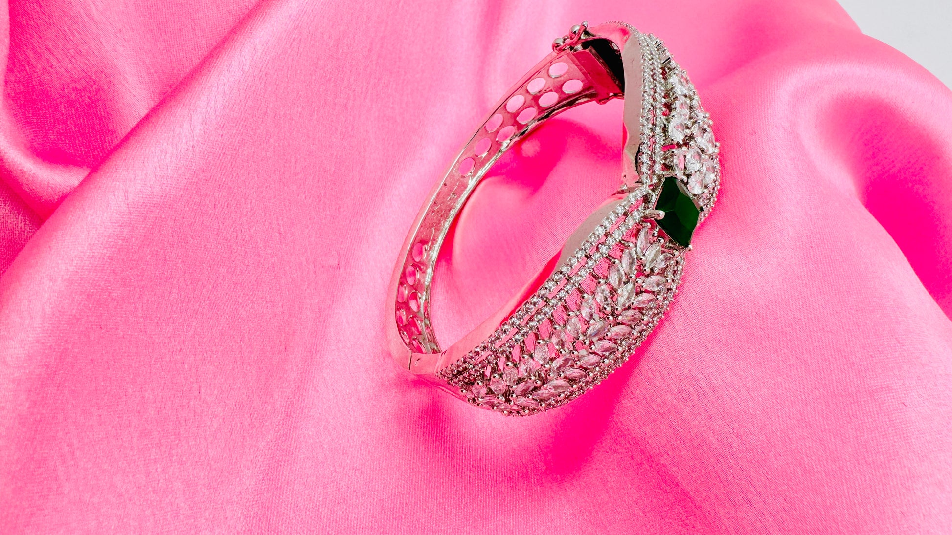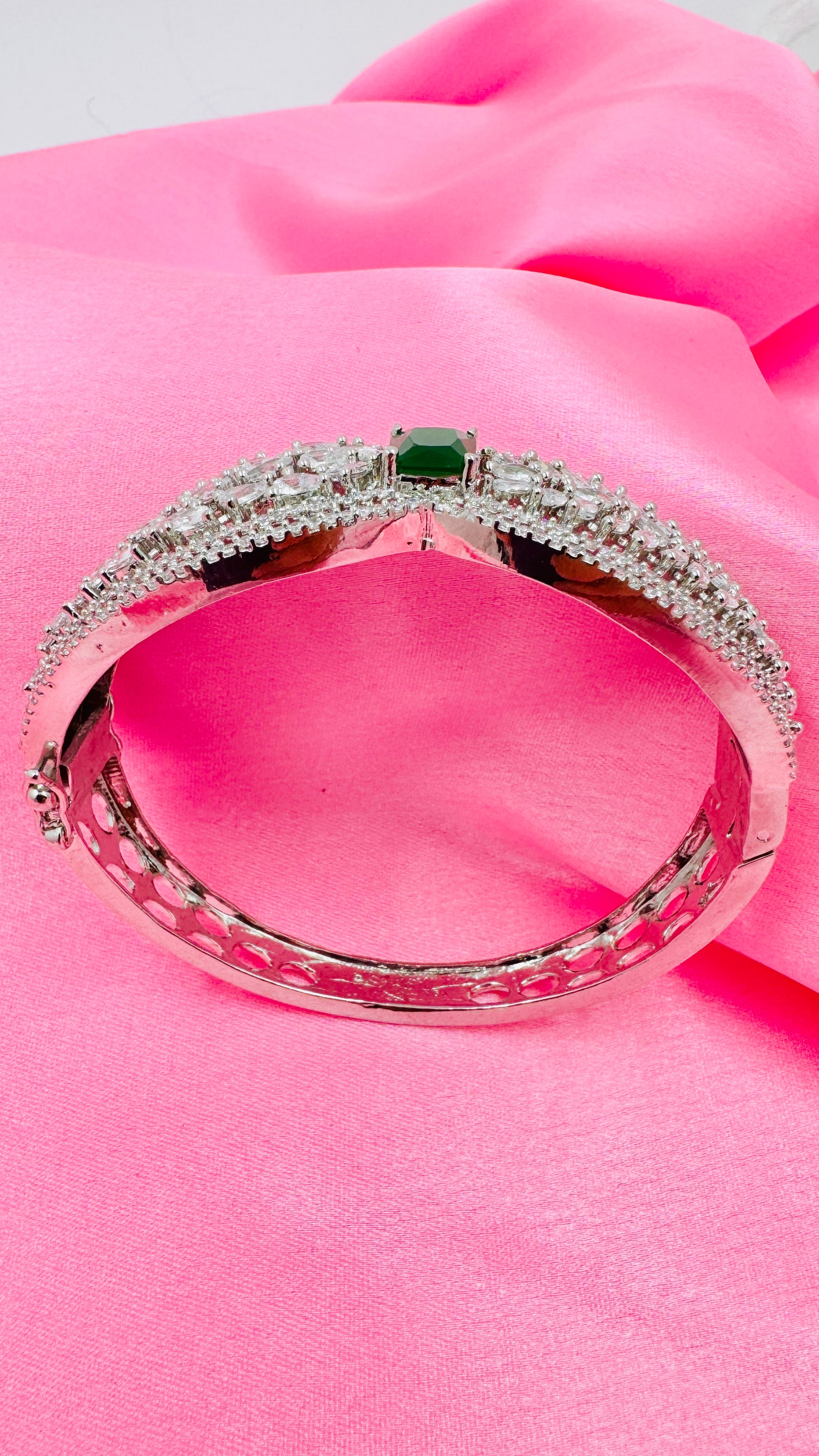 Elevate your style with this stunning American Diamond bracelet, crafted for the modern woman who loves luxury with a touch of elegance. Featuring a breathtaking emerald-green centerpiece, this bracelet is encrusted with high-quality American Diamonds, arranged in an intricate, sparkling design.