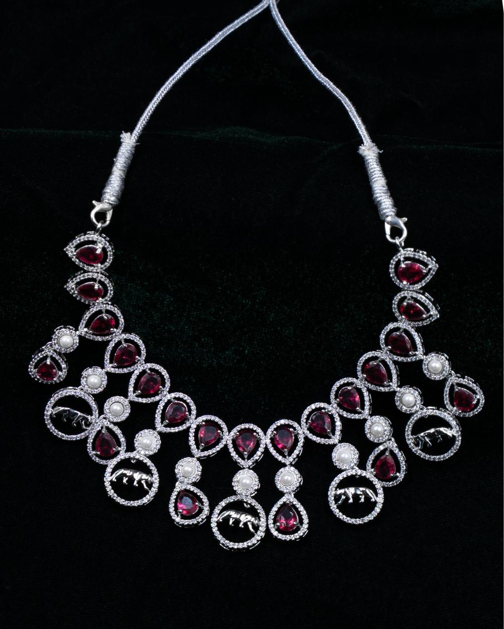 Channel Bollywood’s regal elegance with this breathtaking AD necklace, featuring a bold lion motif that exudes power and grandeur. Encrusted with dazzling American diamonds, the necklace is further adorned with lustrous pearls and rich ruby drop accents, adding a touch of vintage opulence. Inspired by the timeless charm of Bollywood divas, this statement piece is perfect for weddings, red carpet events, and grand celebrations.