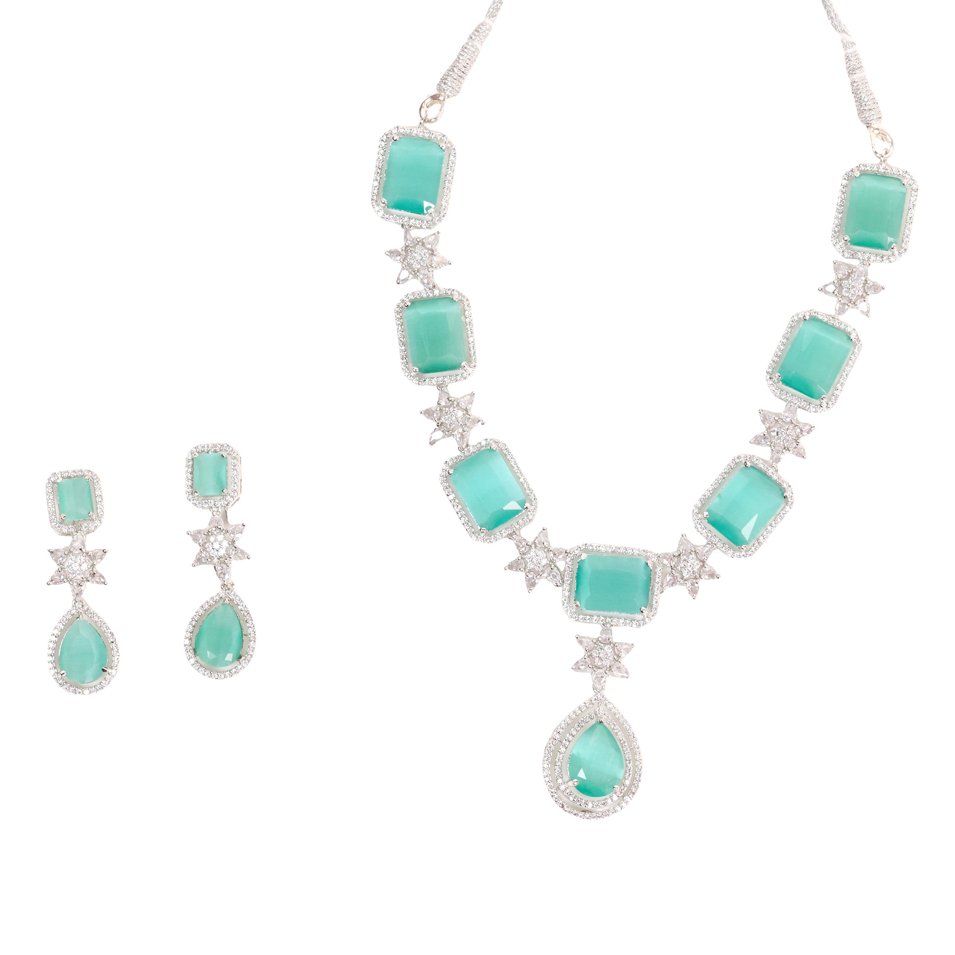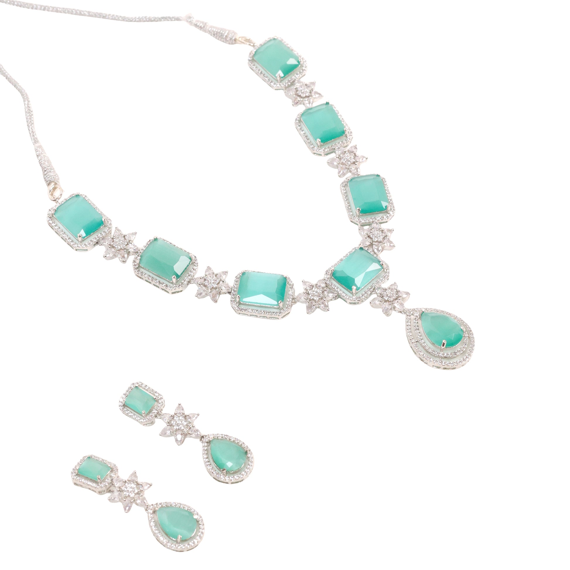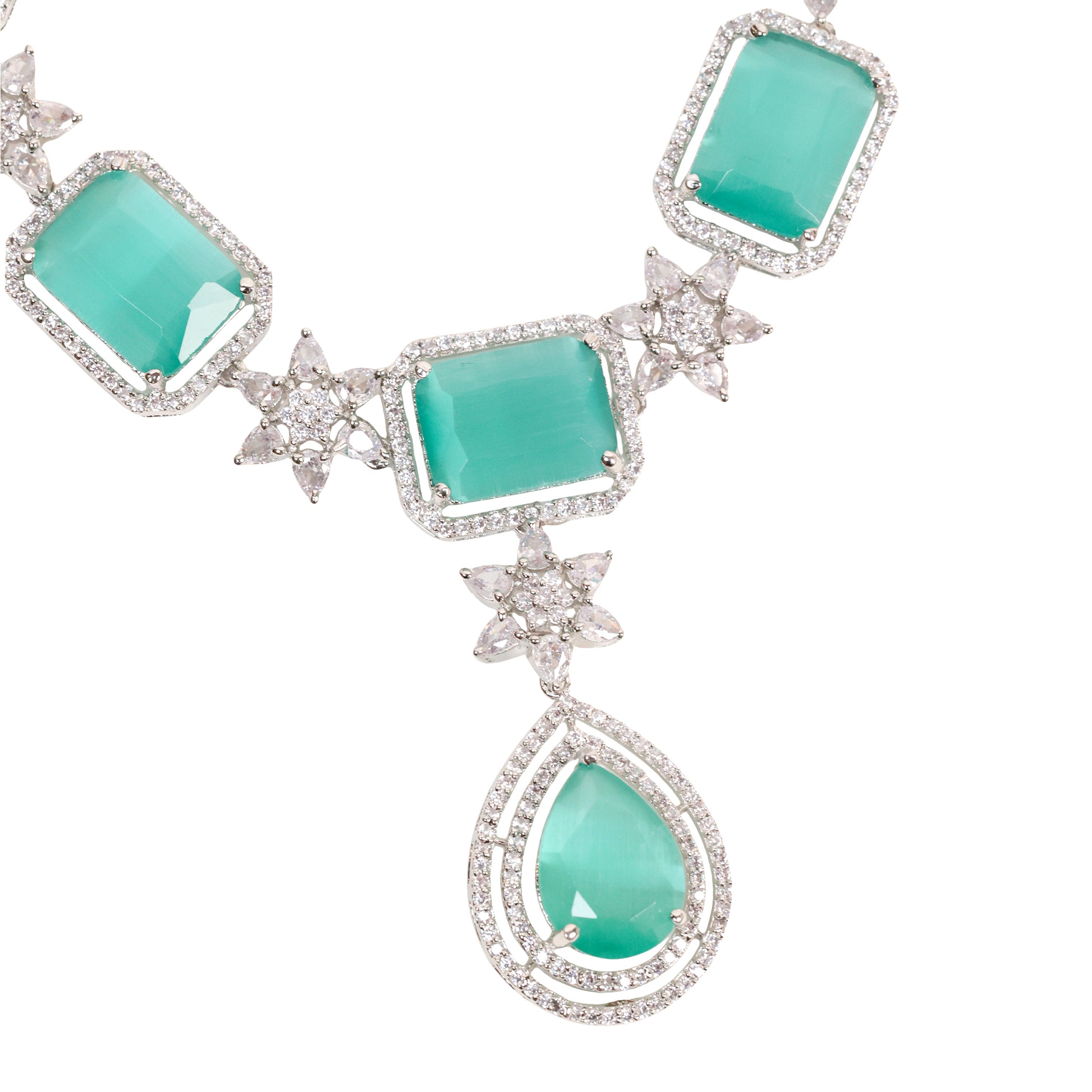 Turn heads with this stunning silver-toned necklace set, adorned with aqua blue gemstones and delicate diamond-like embellishments.