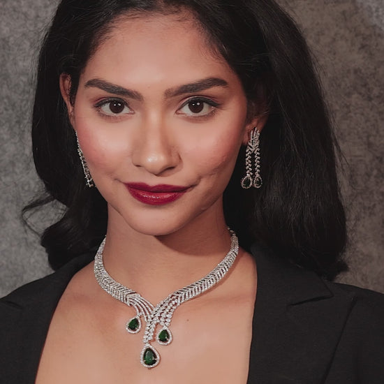 A breathtaking white gold-toned necklace, intricately designed in a feather-like pattern, adorned with brilliant-cut American diamonds. The cascading strands elegantly flow into three pear-shaped deep green emeralds, outlined with shimmering American diamonds, creating a stunning contrast.