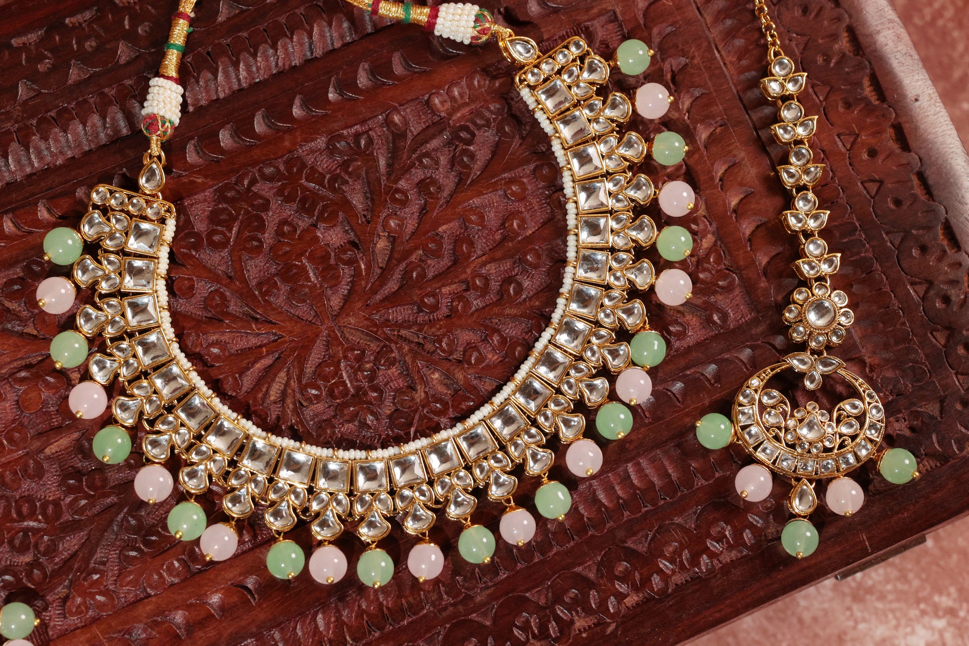 Designed in gold-tone metal, this set features polki (uncut diamonds) work, beautifully accented with pastel green and pink beads for a delicate yet regal appeal. The meticulous craftsmanship and traditional artistry make this jewelry set a must-have for those who appreciate heritage designs.