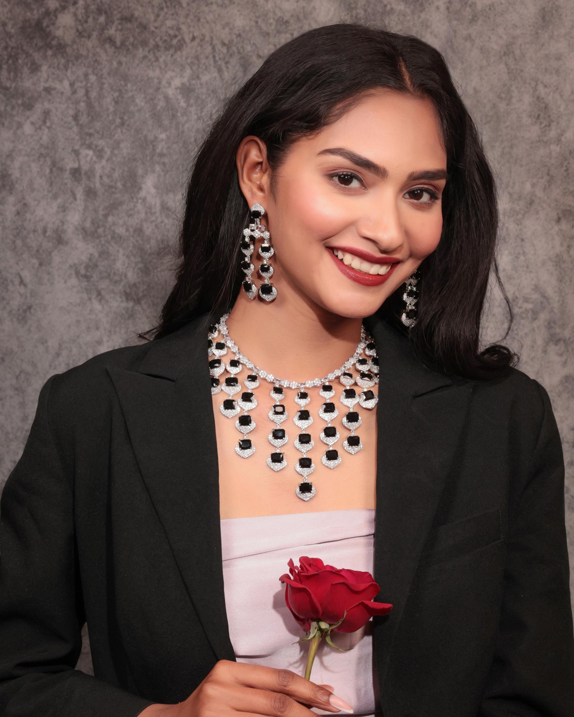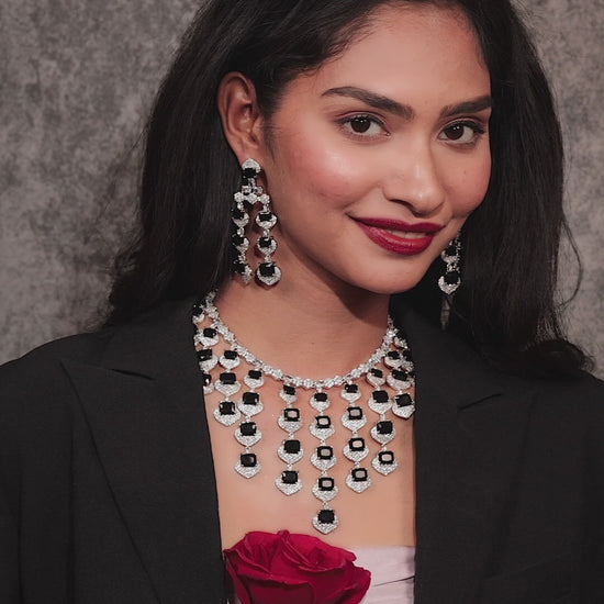 This exquisite necklace set is a bold statement of elegance and sophistication. Featuring cascading layers of heart-shaped diamond accents, adorned with striking black onyx gemstones, this masterpiece creates a dramatic contrast that captivates attention.