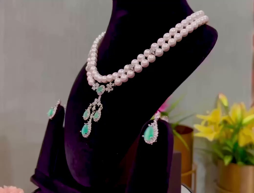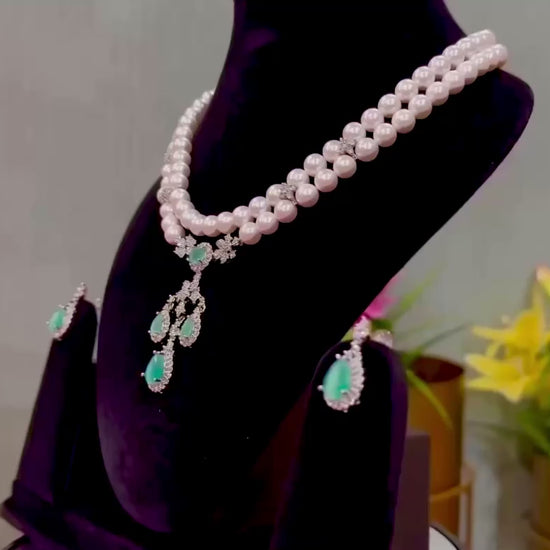 An exquisite masterpiece, this necklace set blends the timeless elegance of pearls with the enchanting allure of aqua gemstones. Perfect for making a grand statement at high-profile events.