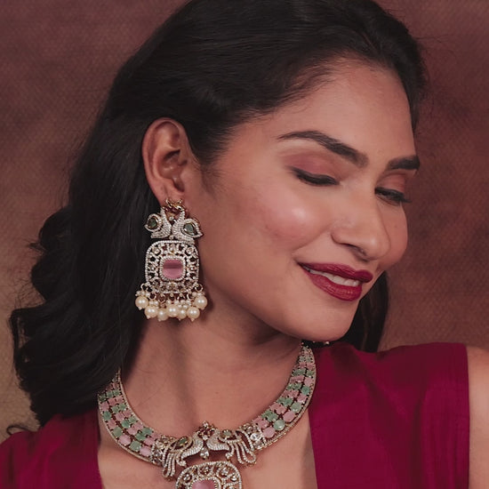 This breathtaking i necklace is a masterpiece of artistry and heritage. Featuring a grand centerpiece adorned with an intricate lattice of Moissanite, stones with AD ( American Diamond ) , this necklace exudes vintage opulence. The delicate pastel pink and green beads along the choker-style band add a soft, ethereal charm, while the royal bird motifs encrusted with fine gemstones symbolize grace and grandeur.