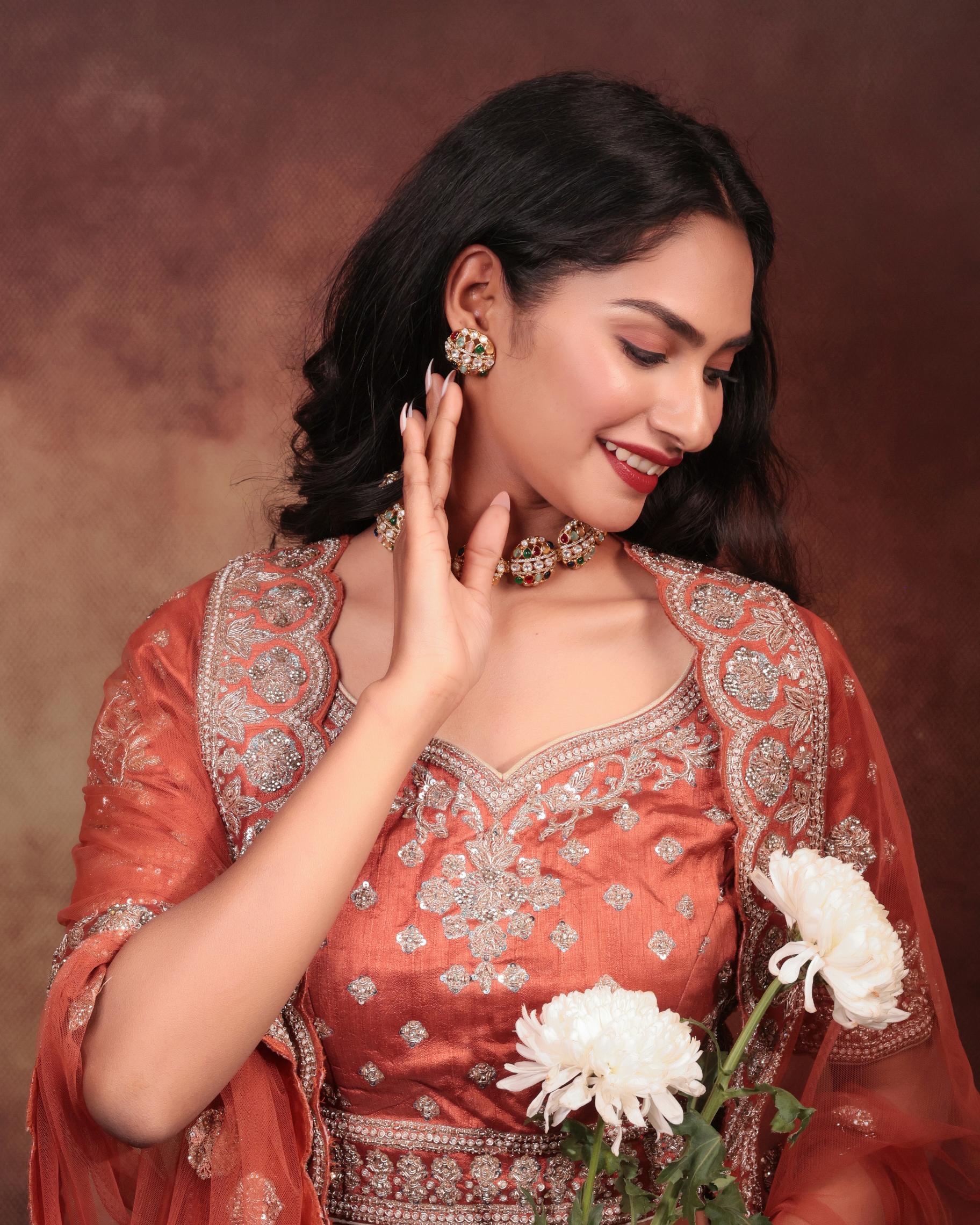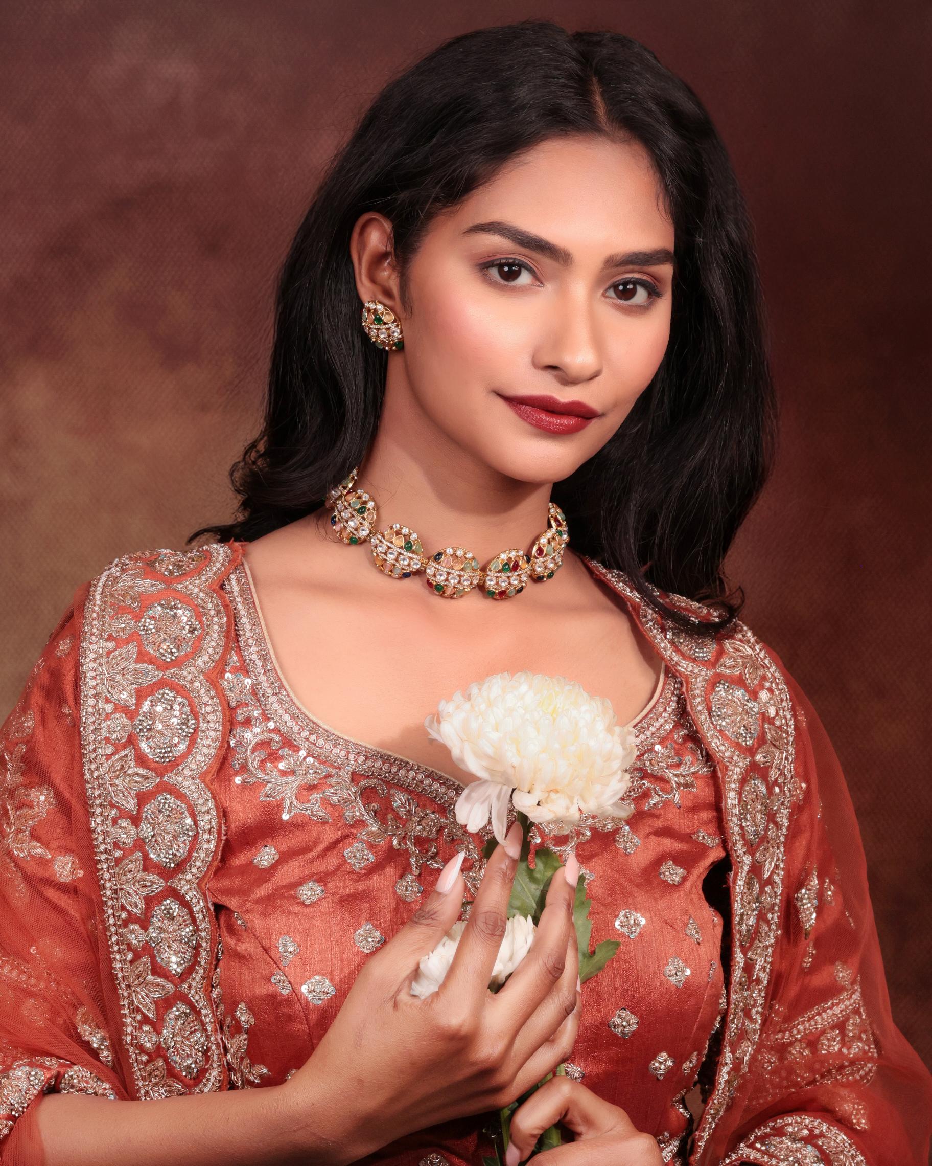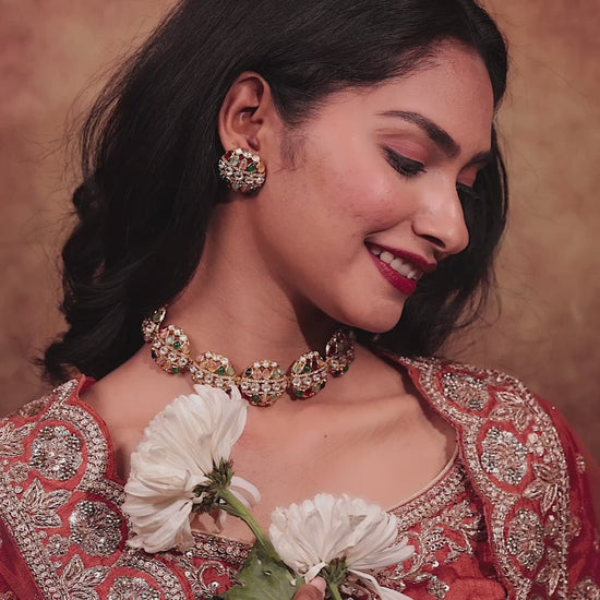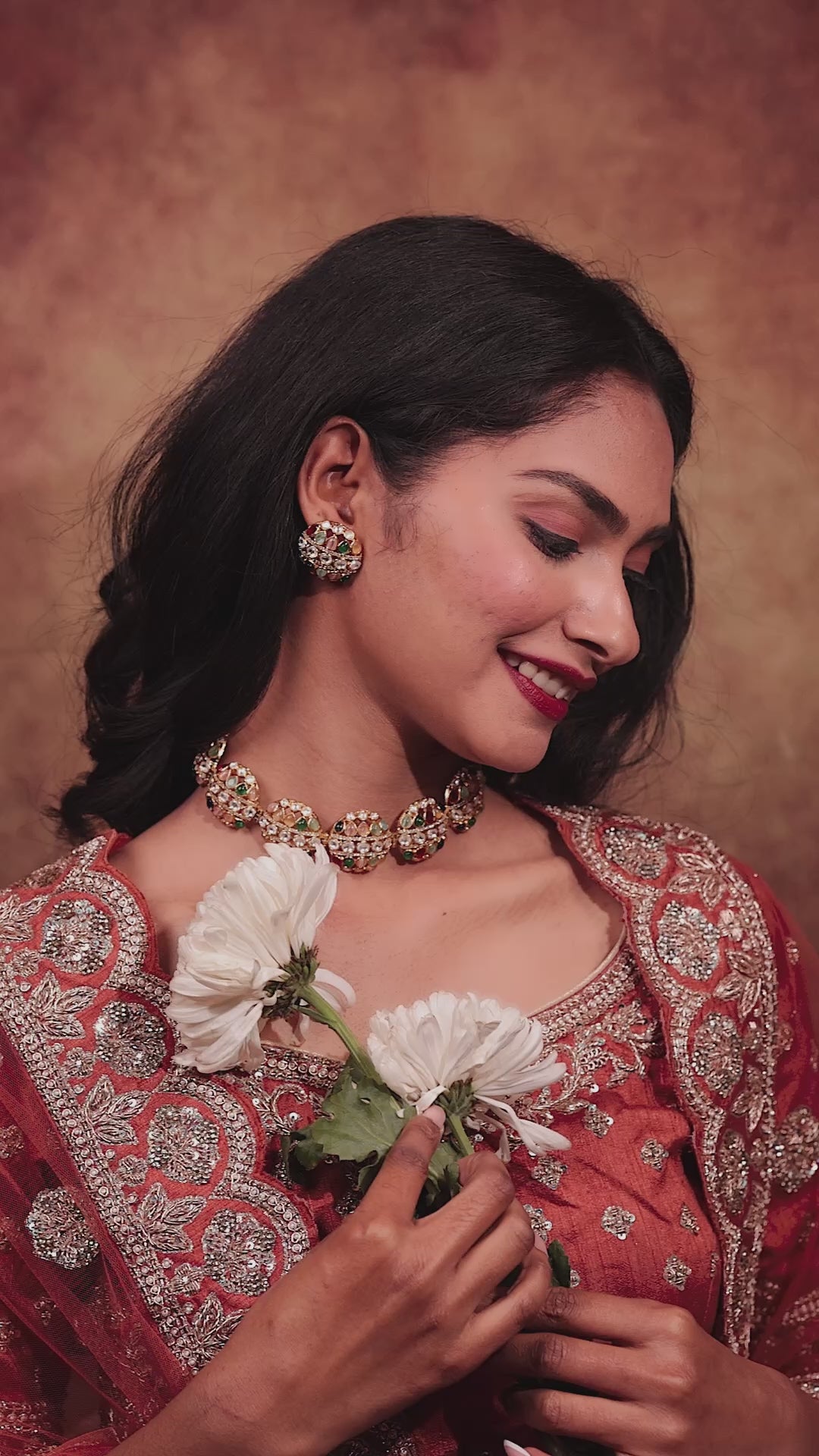 The symmetrical arrangement of gemstones adds a luxurious touch, making this necklace a perfect choice for weddings, festive occasions, and cultural celebrations. Elevate your ensemble with this timeless piece that seamlessly blends heritage and elegance.