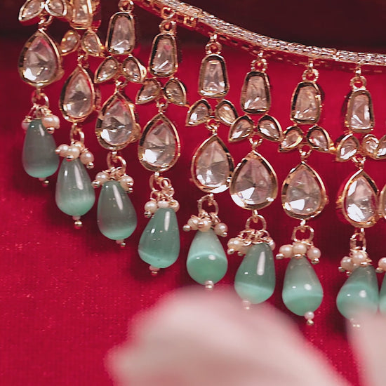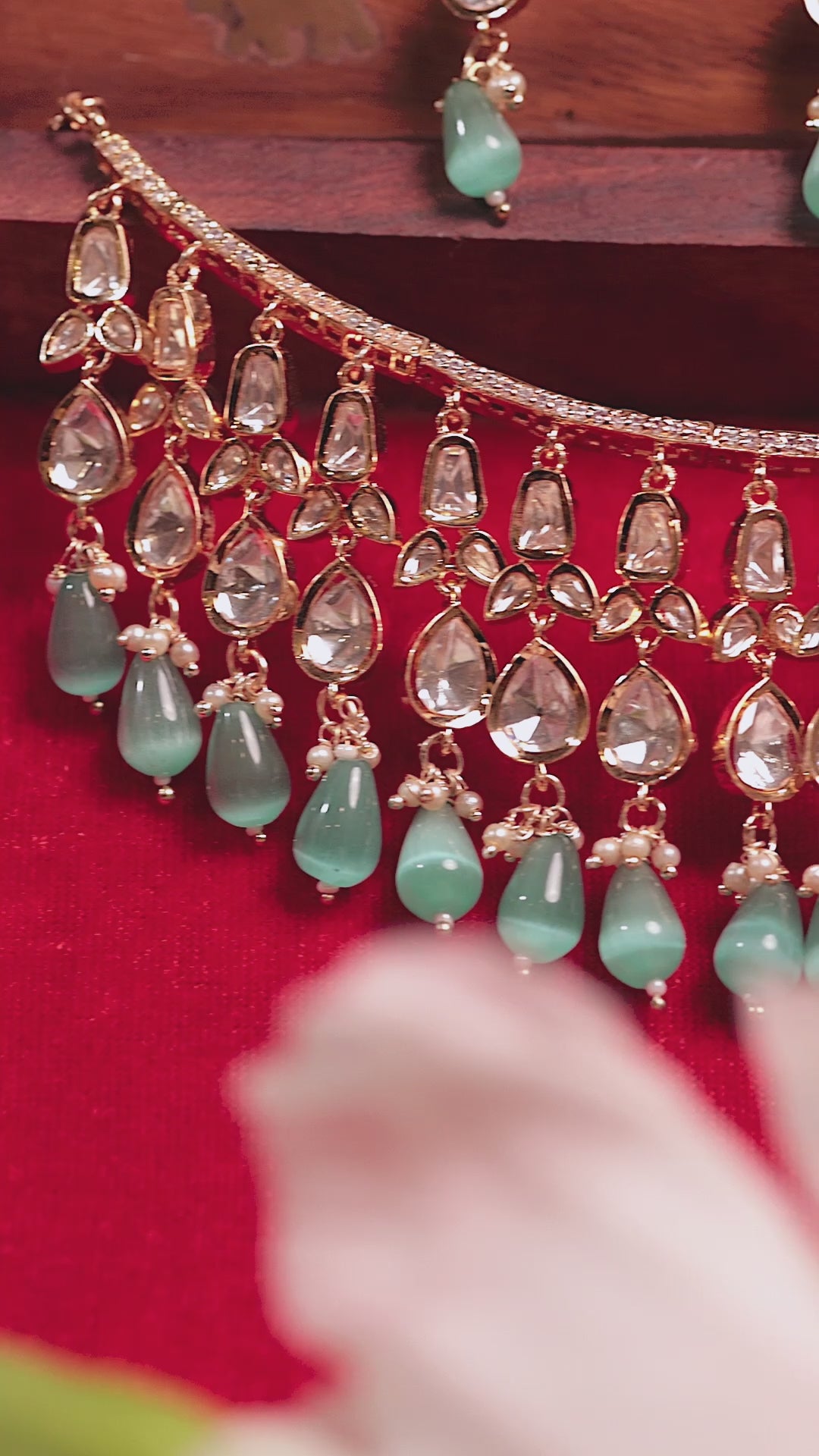 Step into timeless elegance with this exquisite Kundan choker necklace set, adorned with emerald green drop beads. A dazzling combination of polished gold-tone metal, uncut Kundan stones, and delicate pearl accents creates a luxurious masterpiece, perfect for weddings and grand occasions.