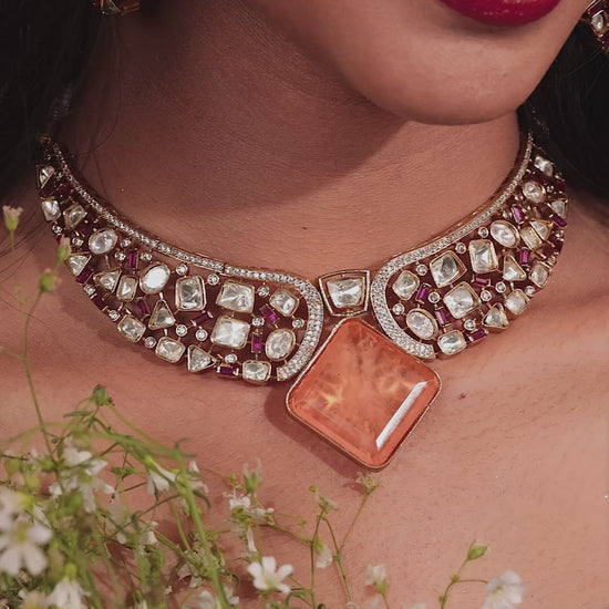 A stunning champagne gold choker adorned with uncut polki diamonds, baguette-cut rubies, and a blush peach square-cut gemstone at the center. The intricate mix of irregular, square, and pave-set stones creates a luxurious, vintage charm.