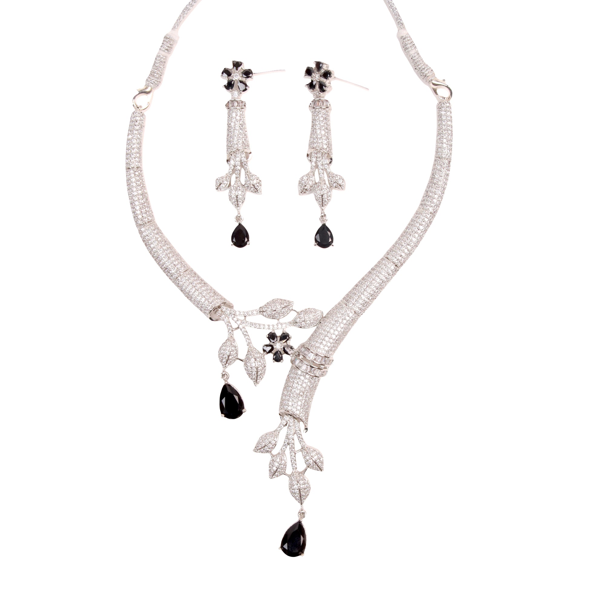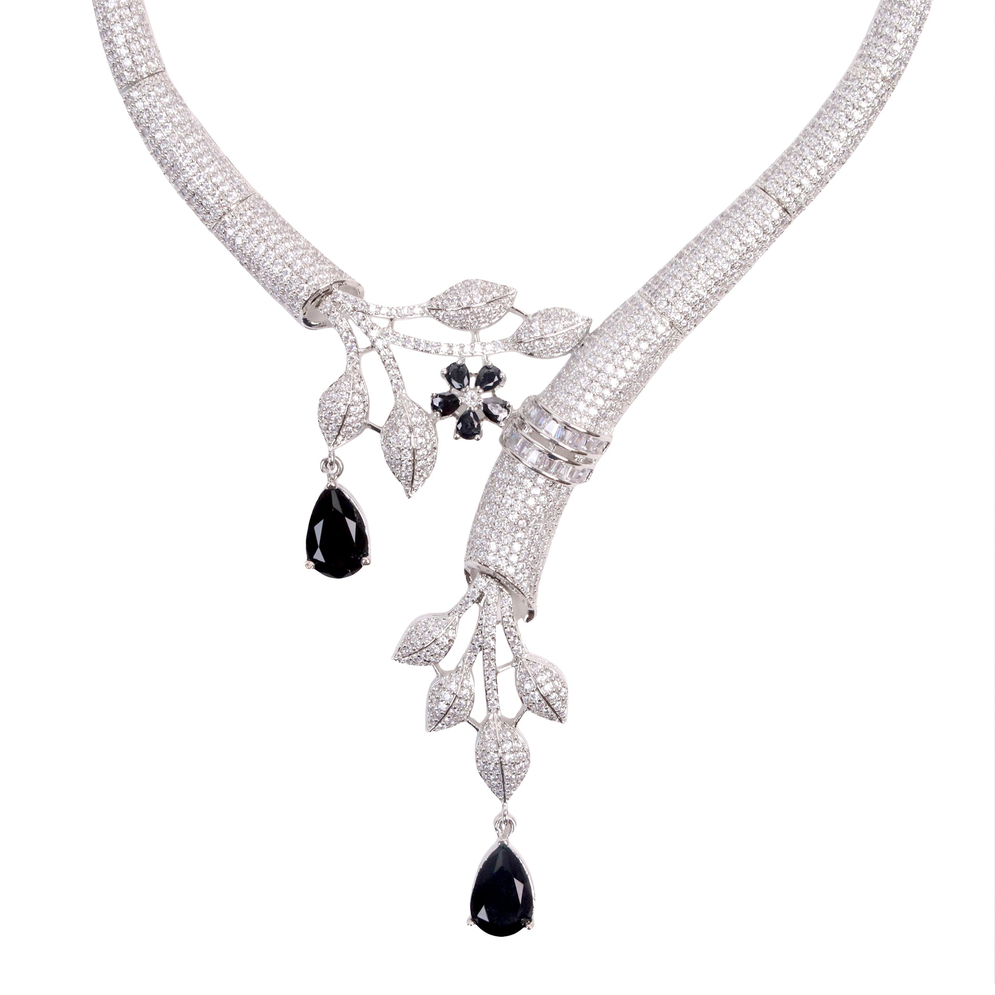 Elevate your elegance with this breathtaking American Diamond necklace set, crafted for those who love to sparkle. Featuring brilliantly cut diamonds and striking black onyx teardrop stones, this piece exudes luxury and timeless charm. The intricate floral and leaf-inspired design ensures you stand out at every occasion!