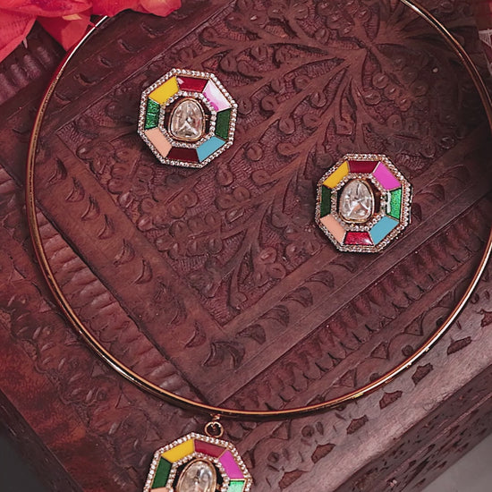 A striking fusion of tradition and modern minimalism, this golden hasli necklace features an exquisite multicolor Meenakari pendant with dazzling Kundan embellishments. The geometric design, accented with sparkling stones, makes this piece a bold statement of artistry and heritage.